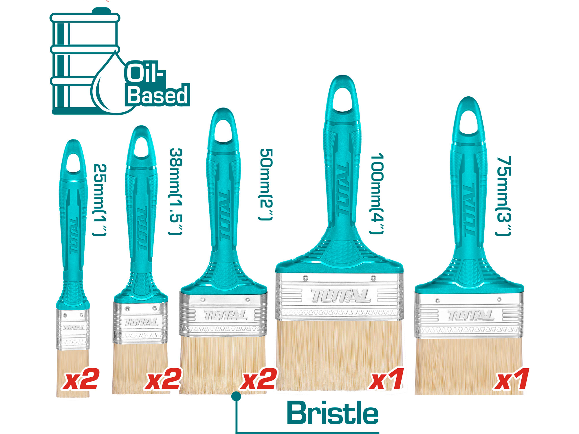 - 2 pensler med en bredde på 25 mm. Perfekt til små detaljer og svært tilgængelige områder. - 2 pensler med en bredde på 38 mm. Velegnet til mellemstore områder og generelle maleprojekter. - 2 pensler med en bredde på 50 mm. Ideel til større områder og brede strøg. - 1 pensel med en bredde på 75 mm. Perfekt til store områder og maling af store overflader. - 1 pensel med en bredde på 100 mm. Ideel til meget store områder og overflader, der kræver bred dækning.Uanset om du er professionel maler eller gør-det-selv-entusiast, giver dette penselsæt dig den alsidighed, du skal bruge for at gøre dit projekt til en succes.