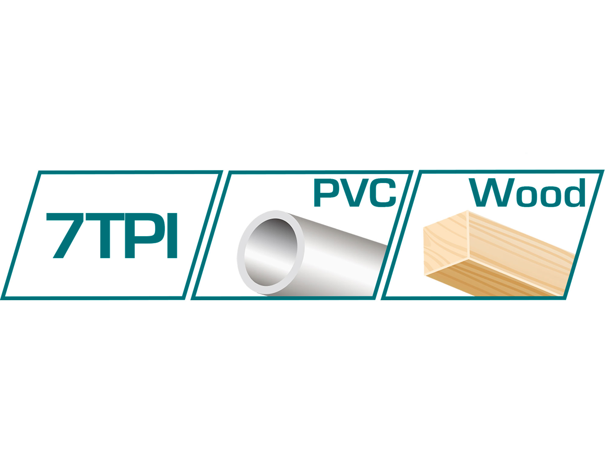 Saven har 7 tænder pr. tomme (TPI), hvilket gør den ideel til at skære i forskellige materialer. Jo højere TPI-nummer, jo finere snit producerer saven.