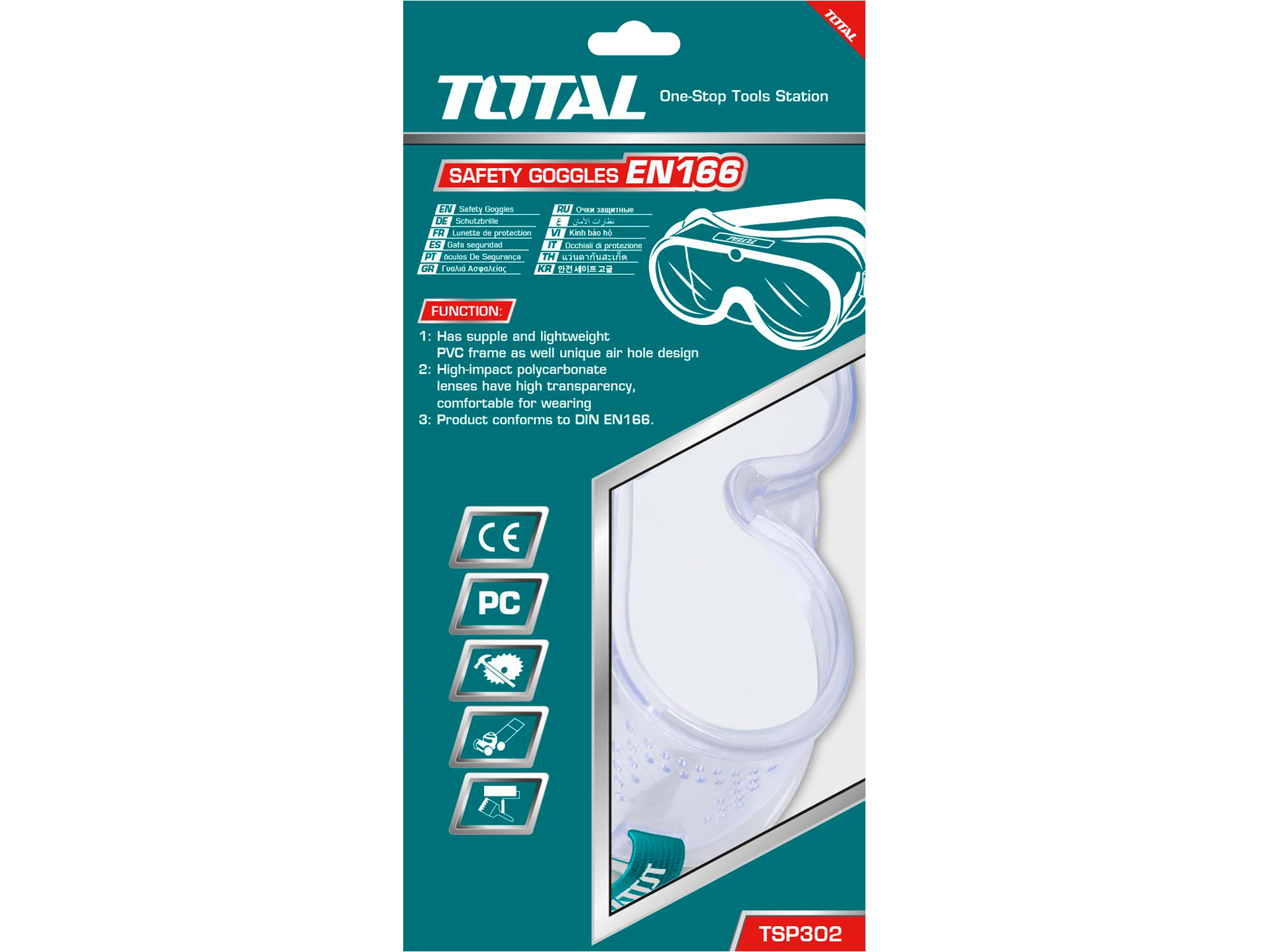Det fleksible PVC-stel sikrer en behagelig pasform og tilpasser sig perfekt til enhver ansigtsform. De hårde polykarbonatlinser er ridsefaste og har en høj slagfasthed for at beskytte dine øjne mod væsker, støv og mekaniske påvirkninger. De giver også optimal beskyttelse i stærkt sollys takket være UV-beskyttelse.