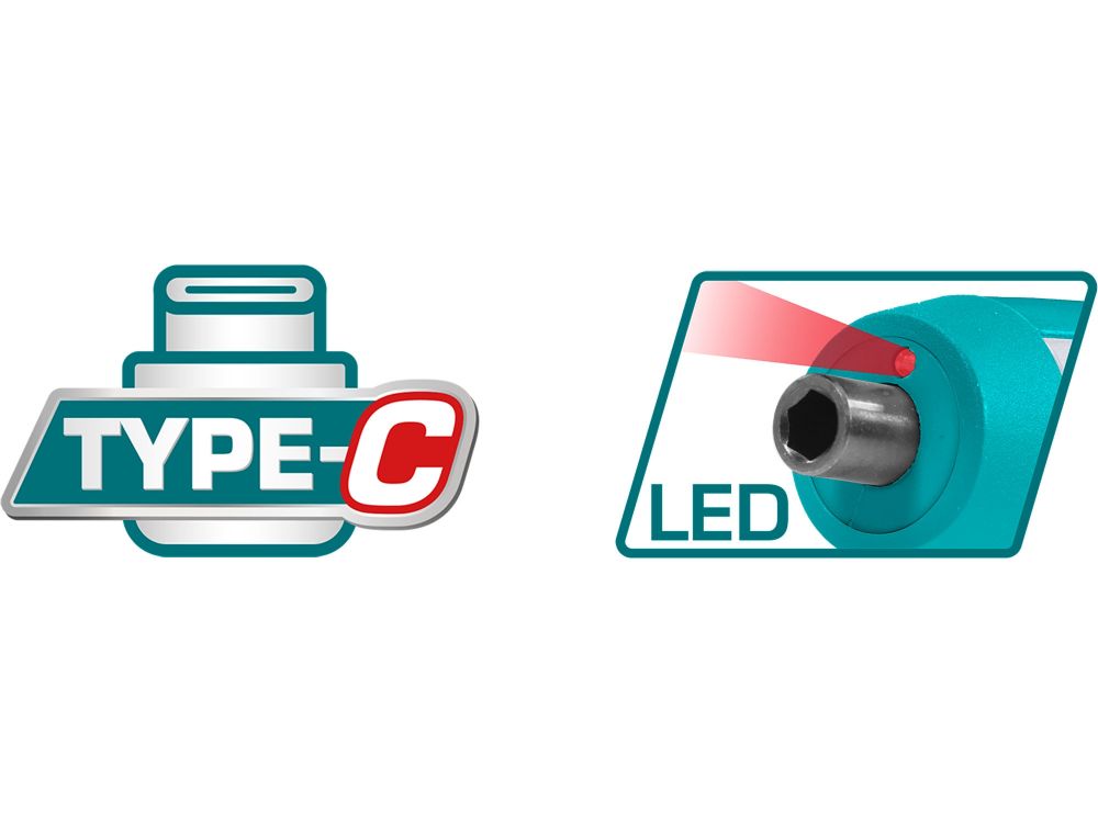 - USB-opladning - Med TOTAL bit-sæt - LED-belysning - Momentkontakt og LED-momentindikator - Rotation mod uret og med uret - Kompakt og praktisk designLeveringsomfang: