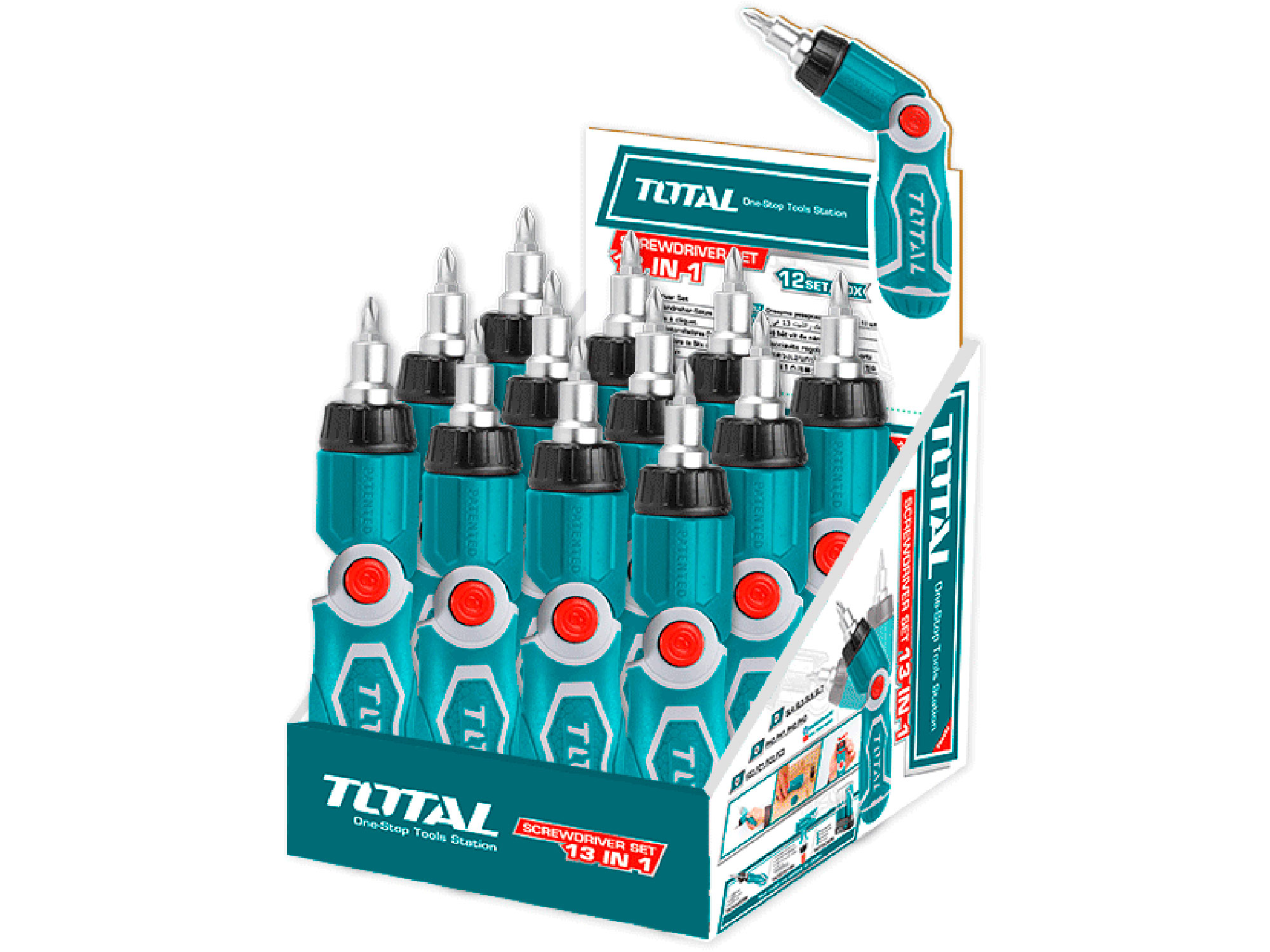 Total 13-i-1-skruetrækkersættet fra er kompakt og let, så det er nemt at opbevare og transportere. Det er ideelt til brug på værkstedet, i hjemmet eller på byggepladsen. Den giver fremragende værdi for pengene og er et uundværligt værktøj i enhver værktøjskasse.