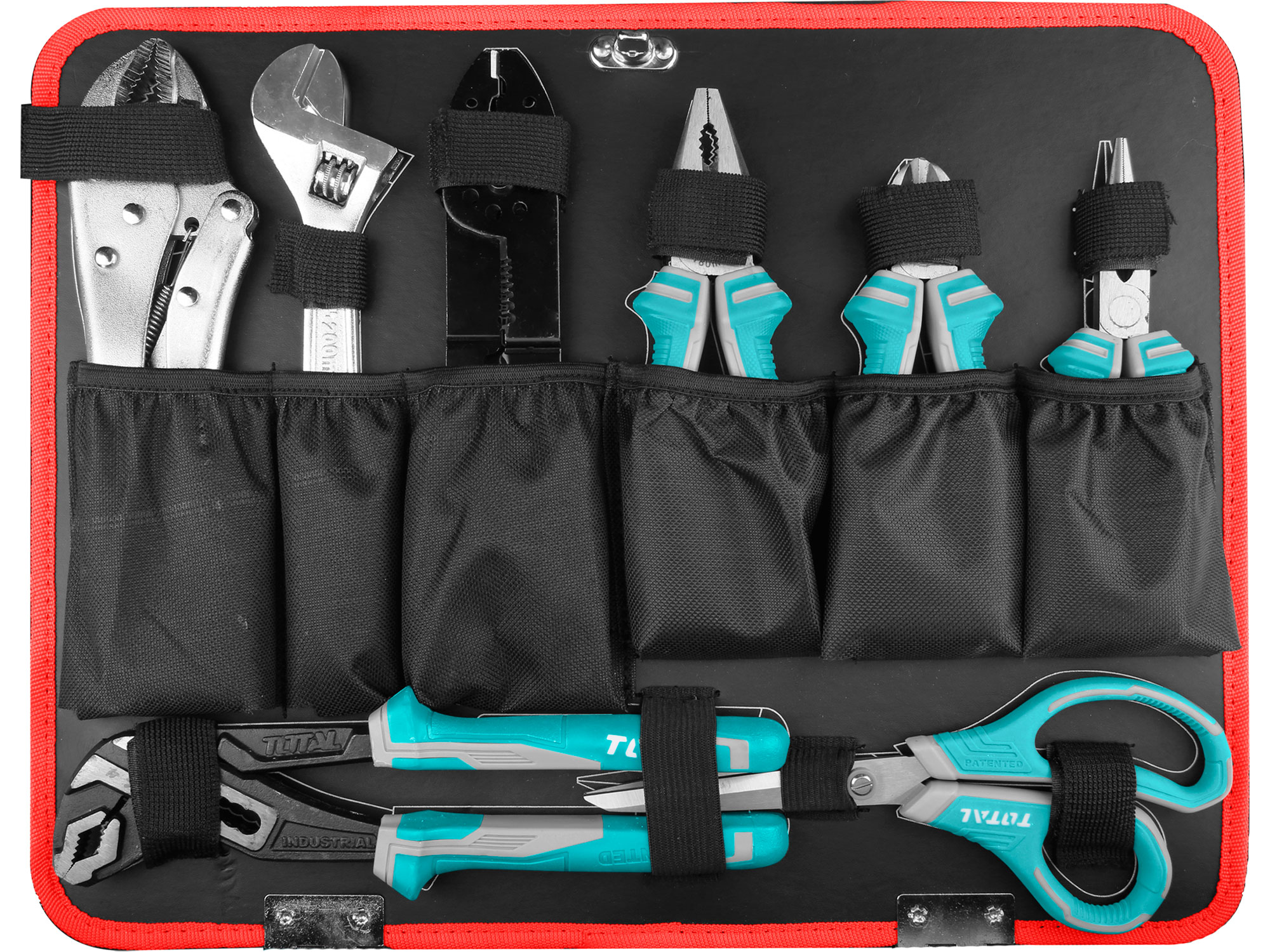 Tænger: 180 mm kombineret, 160 mm halvrund lige og 160 mm skærende side, 1 par SIKO-tænger 250 mm, 1 par hurtigudløsende tænger 250 mm, 1 par afisoleringstænger 200 mm