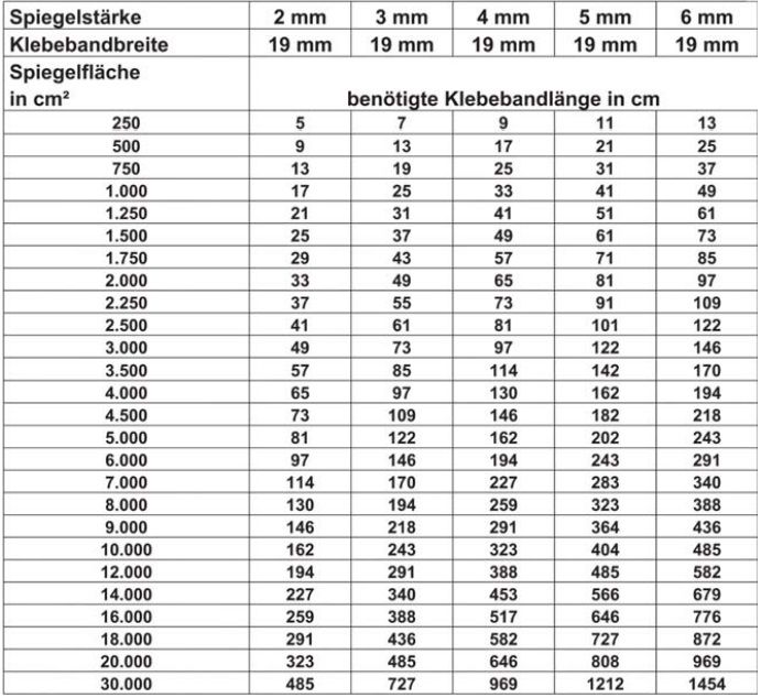 Særlig bemærkning: Ved limning skal de tekniske retningslinjer fra Institut des Glaserhandwerks of Verlagsanstalt Handwerk GmbH, Düsseldorf nr. 11 udgave 2006/11 overholdes. Ved limning over hovedhøjde og i vinkler kan spejlklæbebåndene kun bruges som monteringshjælp , og mekanisk fastgørelse er absolut nødvendig.
